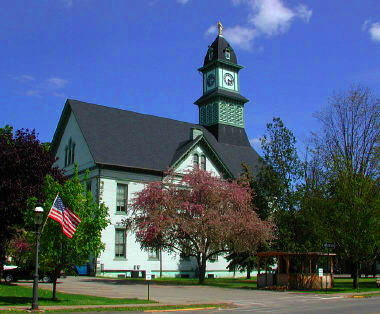 A cupola clock keeps time for the town. It was a gift of Henry Hatch Dent. A courthouse bell was donated by the Hon. Timothy Ives.